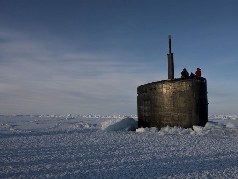 美軍攻擊核潛艇從北極冰面下鉆出 展示美國國旗