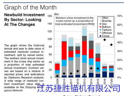 據(jù)專業(yè)的電動(dòng)系纜絞盤制造廠-江蘇捷勝訊:進(jìn)入2017年,全球新造船市場出現(xiàn)了初步復(fù)蘇跡象,新船訂單投資價(jià)值已經(jīng)超過330億美元,同比大增58%。其中,郵輪新船訂單量依然維持堅(jiān)挺,油船和液化氣船同比增幅分別達(dá)到133%、176%,成為新造船市場的熱點(diǎn),而中韓船廠成為最大的受益者。